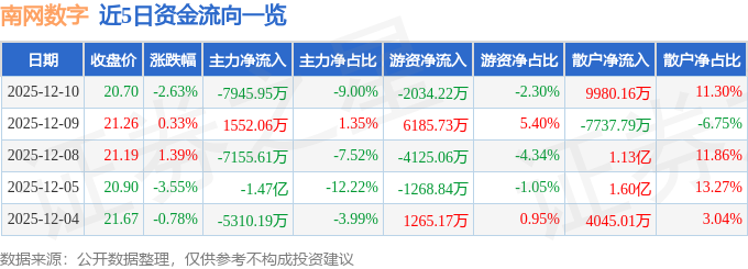 证券之星消息,截至2025年12月10日收盘,南网数字(301638)报收于20.7元,下跌2.63%,换手率18.14%,成交量42.62万手,成交额8.83亿元。