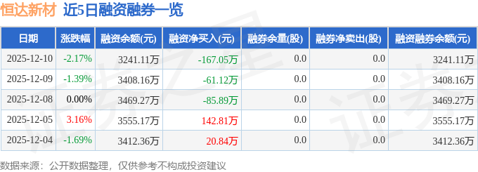 恒达新材融资融券信息显示,融资方面,当日融资买入156.48万元,融资偿还323.52万元,融资净偿还167.05万元。融券方面,融券卖出0.0股,融券偿还0.0股,融券余量0.0股,融券余额0.0万元。融资融券余额3241.11万元。