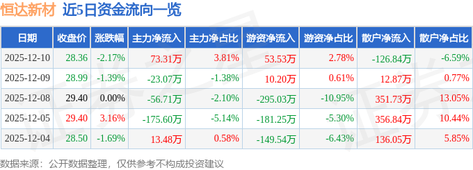 证券之星消息,截至2025年12月10日收盘,恒达新材(301469)报收于28.36元,下跌2.17%,换手率1.46%,成交量6710.0手,成交额1925.51万元。