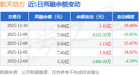 证券之星消息,12月10日,航天动力(600343)融资买入5.29亿元,融资偿还3.88亿元,融资净买入1.41亿元,融资余额9.08亿元,当日融资净买入排名第15。