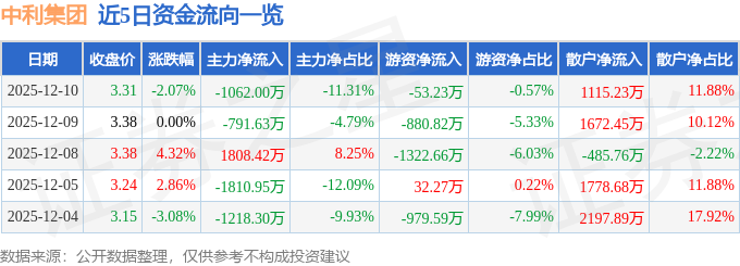 12月10日的资金流向数据方面,主力资金净流出1062.0万元,占总成交额11.31%,游资资金净流出53.23万元,占总成交额0.57%,散户资金净流入1115.23万元,占总成交额11.88%。