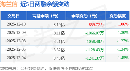 证券之星消息,12月10日,海兰信(300065)融资买入5465.3万元,融资偿还4606.96万元,融资净买入858.34万元,融资余额8.18亿元。