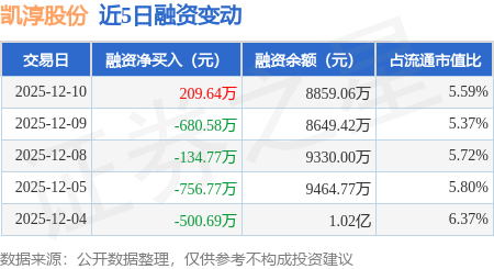 证券之星消息,12月10日,凯淳股份(301001)融资买入1514.18万元,融资偿还1304.54万元,融资净买入209.64万元,融资余额8859.06万元。