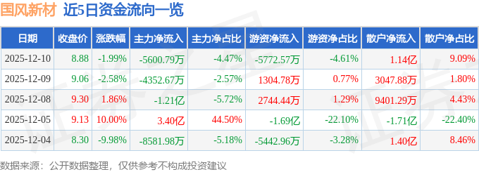 12月10日的资金流向数据方面,主力资金净流出5600.79万元,占总成交额4.47%,游资资金净流出5772.57万元,占总成交额4.61%,散户资金净流入1.14亿元,占总成交额9.09%。