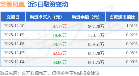 证券之星消息,12月10日,安徽凤凰(920000)融资买入209.76万元,融资偿还122.6万元,融资净买入87.17万元,融资余额907.28万元。