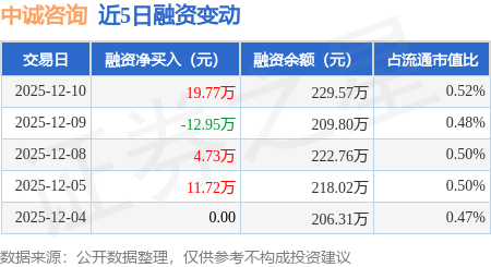 证券之星消息,12月10日,中诚咨询(920003)融资买入26.57万元,融资偿还6.81万元,融资净买入19.77万元,融资余额229.57万元。