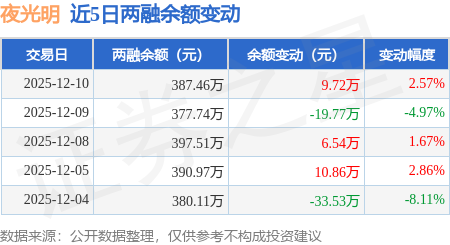 证券之星消息,12月10日,夜光明(920527)融资买入15.3万元,融资偿还5.58万元,融资净买入9.72万元,融资余额387.46万元。