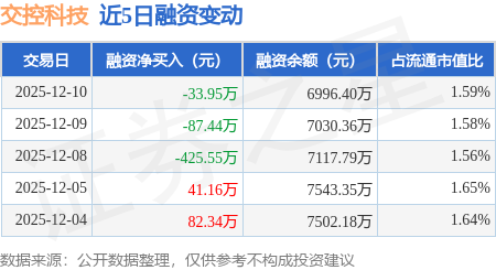 证券之星消息,12月10日,交控科技(688015)融资买入477.11万元,融资偿还511.06万元,融资净卖出33.95万元,融资余额6996.4万元。