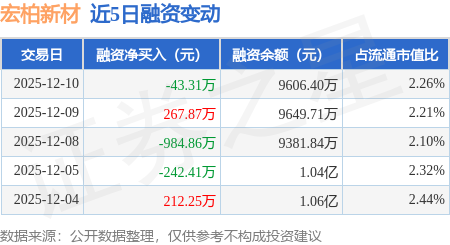 证券之星消息,12月10日,宏柏新材(605366)融资买入902.88万元,融资偿还946.19万元,融资净卖出43.31万元,融资余额9606.4万元。
