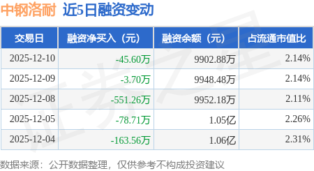 证券之星消息,12月10日,中钢洛耐(688119)融资买入405.89万元,融资偿还451.49万元,融资净卖出45.6万元,融资余额9902.88万元。