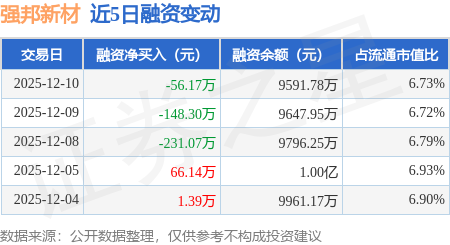 证券之星消息,12月10日,强邦新材(001279)融资买入179.72万元,融资偿还235.89万元,融资净卖出56.17万元,融资余额9591.78万元。