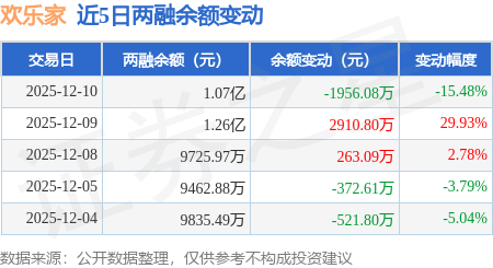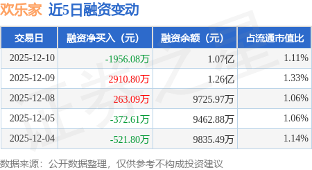证券之星消息,12月10日,欢乐家(300997)融资买入6963.56万元,融资偿还8919.64万元,融资净卖出1956.08万元,融资余额1.07亿元,近20个交易日中有11个交易日出现融资净买入。