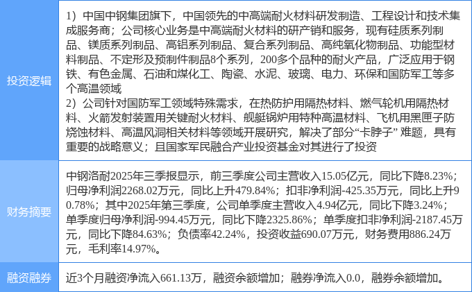 证券之星消息,中钢洛耐12月11日涨停收盘,收盘价4.94元。该股于10点58分涨停,1次打开涨停,截止收盘封单资金为92.4万元,占其流通市值0.02%。