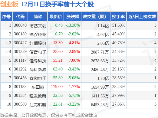 当日创业板换手率前10大个股中4只个股收涨,平均涨幅4.12%,其中德艺文创(300640)以换手率51.6%排第一,8只个股近5个交易日中多次上榜。