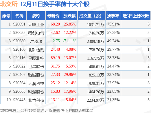 当日北交所换手率前10大个股中9只个股收涨,平均涨幅14.06%,其中大鹏工业(920091)以换手率75.91%排第一,7只个股近5个交易日中多次上榜。