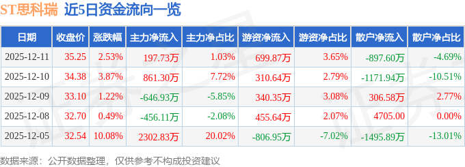 证券之星消息,截至2025年12月11日收盘,ST思科瑞(688053)报收于35.25元,上涨2.53%,换手率5.36%,成交量5.36万手,成交额1.91亿元。