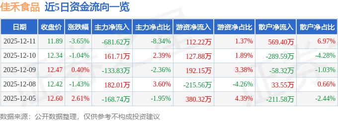 证券之星消息,截至2025年12月11日收盘,佳禾食品(605300)报收于11.89元,下跌3.65%,换手率1.5%,成交量6.82万手,成交额8173.19万元。