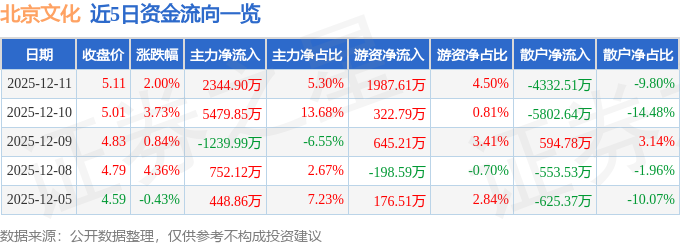 证券之星消息,截至2025年12月11日收盘,北京文化(000802)报收于5.11元,上涨2.0%,换手率12.0%,成交量85.89万手,成交额4.42亿元。
