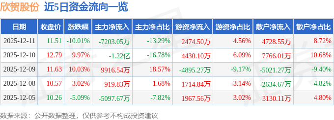 证券之星消息,截至2025年12月11日收盘,欣贺股份(003016)报收于11.51元,下跌10.01%,跌停,换手率11.24%,成交量46.18万手,成交额5.42亿元。