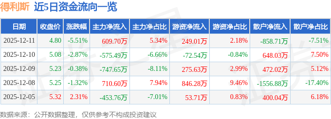 证券之星消息,截至2025年12月11日收盘,得利斯(002330)报收于4.8元,下跌5.51%,换手率3.7%,成交量23.49万手,成交额1.14亿元。