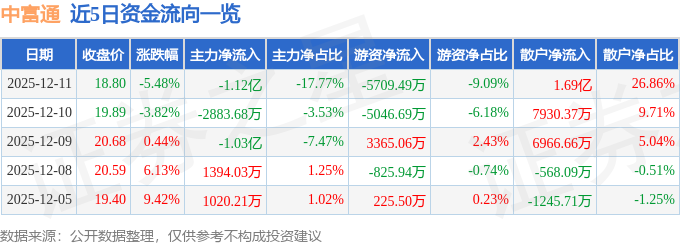 证券之星消息,截至2025年12月11日收盘,中富通(300560)报收于18.8元,下跌5.48%,换手率17.37%,成交量32.48万手,成交额6.28亿元。