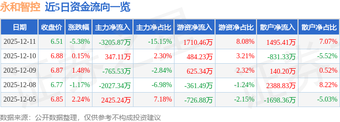证券之星消息,截至2025年12月11日收盘,永和智控(002795)报收于6.51元,下跌5.38%,换手率7.33%,成交量31.9万手,成交额2.12亿元。