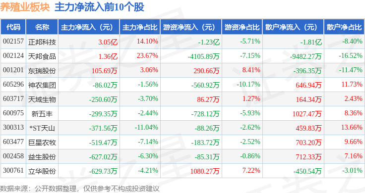 从资金流向上来看,当日养殖业板块主力资金净流出1.86亿元,游资资金净流入5782.23万元,散户资金净流入1.28亿元。养殖业板块个股资金流向见下表:
