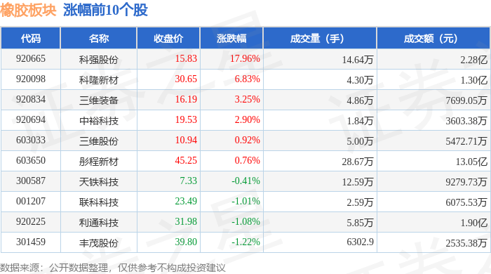 证券之星消息,12月11日橡胶板块较上一交易日下跌1.06%,远翔新材领跌。当日上证指数报收于3873.32,下跌0.7%。深证成指报收于13147.39,下跌1.27%。橡胶板块个股涨跌见下表: