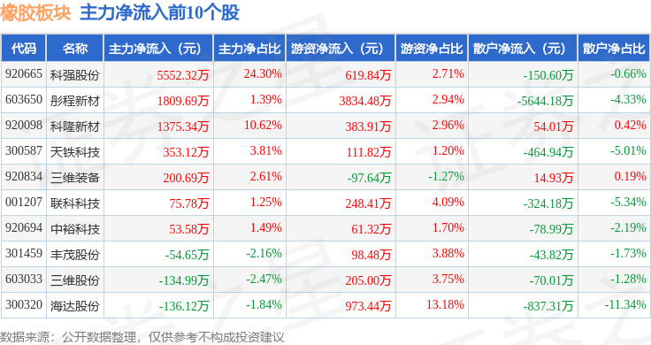 从资金流向上来看,当日橡胶板块主力资金净流出1.04亿元,游资资金净流入1.06亿元,散户资金净流出219.66万元。橡胶板块个股资金流向见下表: