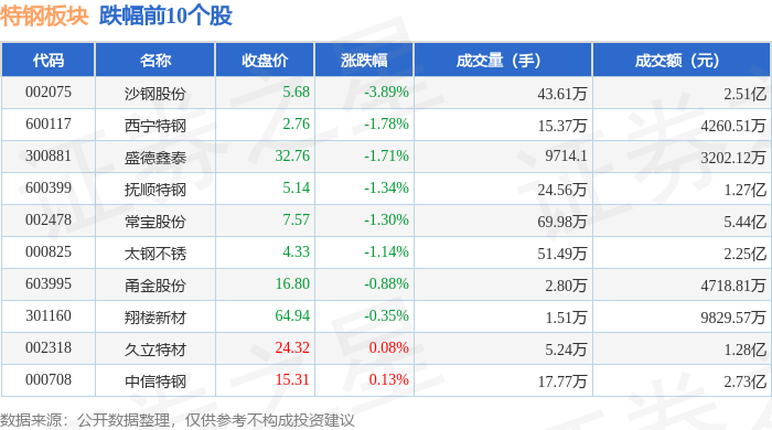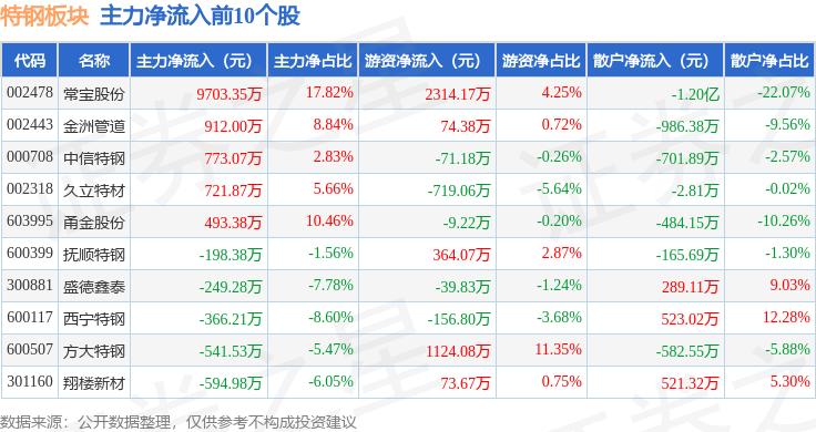从资金流向上来看,当日特钢板块主力资金净流入5311.24万元,游资资金净流入5928.62万元,散户资金净流出1.12亿元。特钢板块个股资金流向见下表: