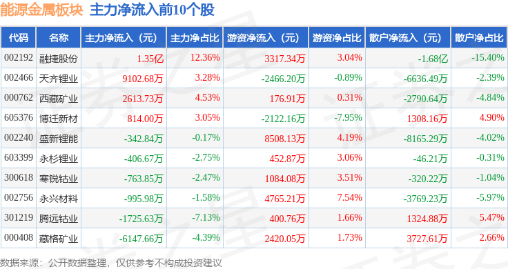 从资金流向上来看,当日能源金属板块主力资金净流出3.77亿元,游资资金净流入5.63亿元,散户资金净流出1.86亿元。能源金属板块个股资金流向见下表: