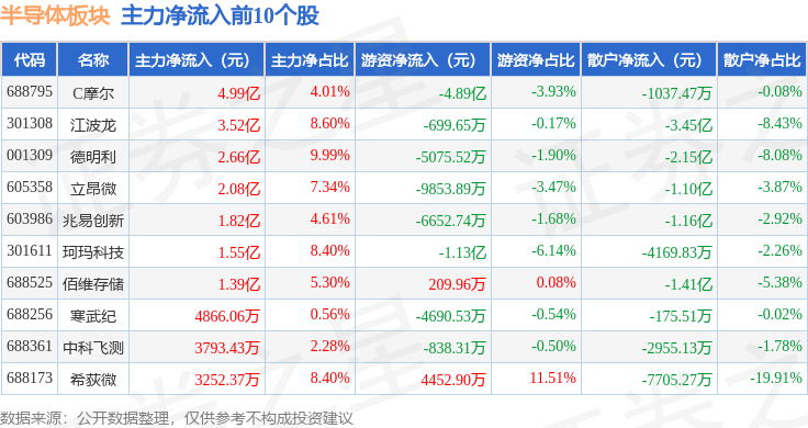 从资金流向上来看,当日半导体板块主力资金净流出46.46亿元,游资资金净流入17.12亿元,散户资金净流入29.34亿元。半导体板块个股资金流向见下表: