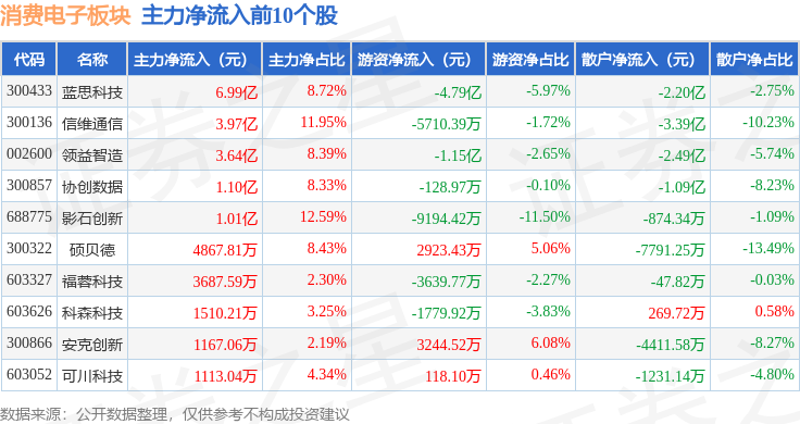 从资金流向上来看,当日消费电子板块主力资金净流出40.89亿元,游资资金净流入3.77亿元,散户资金净流入37.12亿元。消费电子板块个股资金流向见下表: