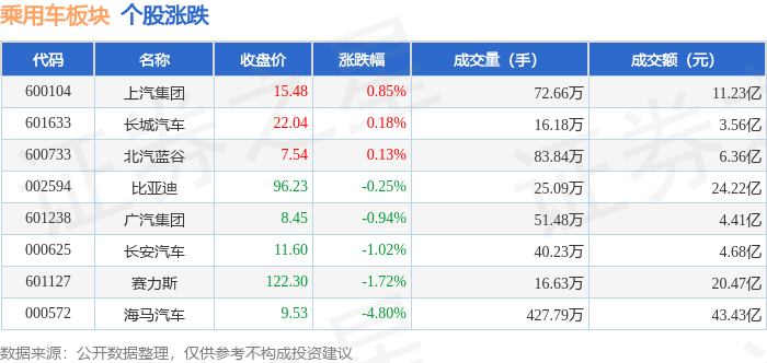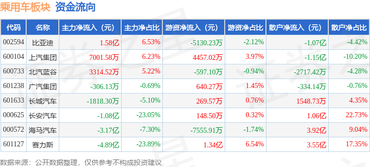 从资金流向上来看,当日乘用车板块主力资金净流出6.74亿元,游资资金净流入5627.57万元,散户资金净流入6.17亿元。乘用车板块个股资金流向见下表: