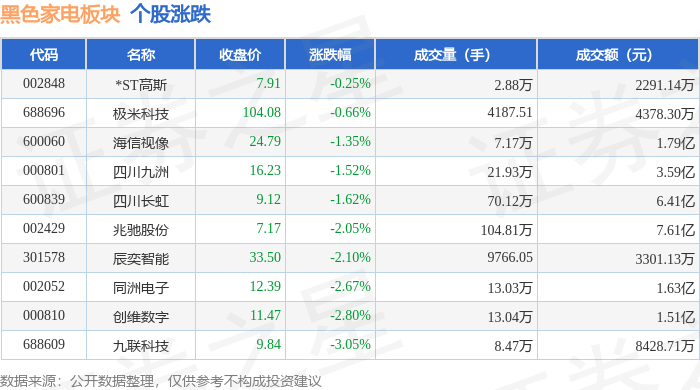 证券之星消息,12月11日黑色家电板块较上一交易日下跌1.79%,九联科技领跌。当日上证指数报收于3873.32,下跌0.7%。深证成指报收于13147.39,下跌1.27%。黑色家电板块个股涨跌见下表: