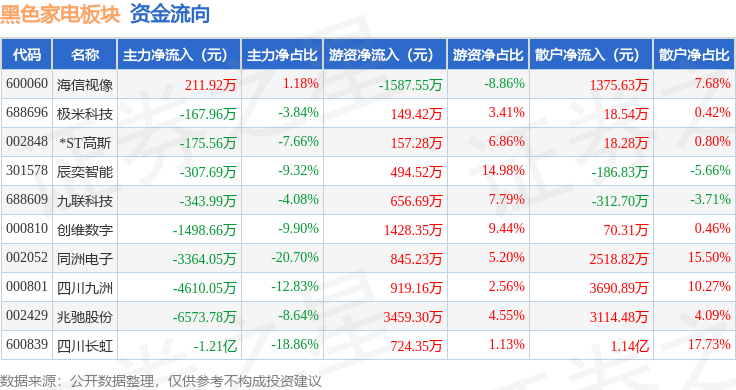 从资金流向上来看,当日黑色家电板块主力资金净流出2.89亿元,游资资金净流入7246.76万元,散户资金净流入2.17亿元。黑色家电板块个股资金流向见下表: