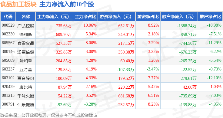 从资金流向上来看,当日食品加工板块主力资金净流出3.16亿元,游资资金净流出2315.23万元,散户资金净流入3.39亿元。食品加工板块个股资金流向见下表: