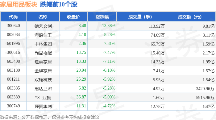 证券之星消息,12月11日家居用品板块较上一交易日下跌1.93%,德艺文创领跌。当日上证指数报收于3873.32,下跌0.7%。深证成指报收于13147.39,下跌1.27%。家居用品板块个股涨跌见下表: