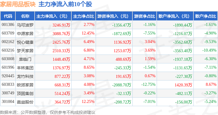 从资金流向上来看,当日家居用品板块主力资金净流出2.63亿元,游资资金净流入1.14亿元,散户资金净流入1.49亿元。家居用品板块个股资金流向见下表: