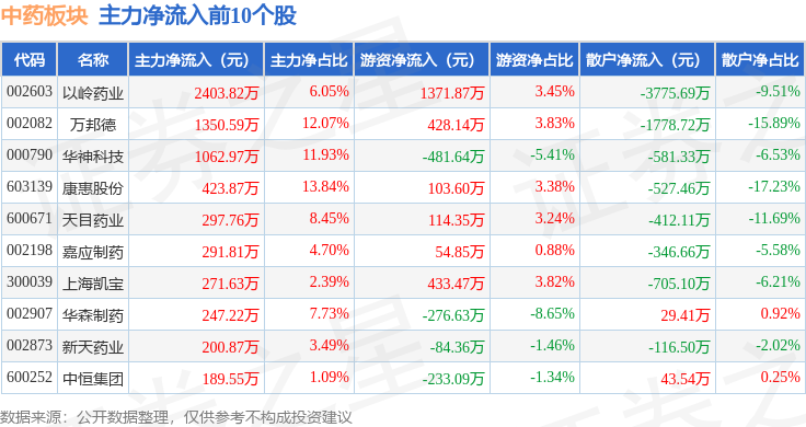 从资金流向上来看,当日中药板块主力资金净流出6.65亿元,游资资金净流入9478.02万元,散户资金净流入5.7亿元。中药板块个股资金流向见下表: