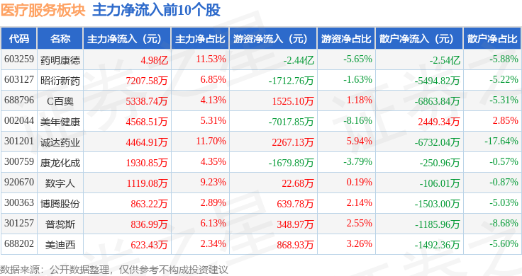 从资金流向上来看,当日医疗服务板块主力资金净流入4.08亿元,游资资金净流出1.65亿元,散户资金净流出2.43亿元。医疗服务板块个股资金流向见下表: