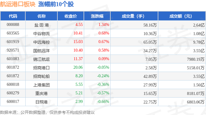 证券之星消息,12月11日航运港口板块较上一交易日下跌0.79%,兴通股份领跌。当日上证指数报收于3873.32,下跌0.7%。深证成指报收于13147.39,下跌1.27%。航运港口板块个股涨跌见下表: