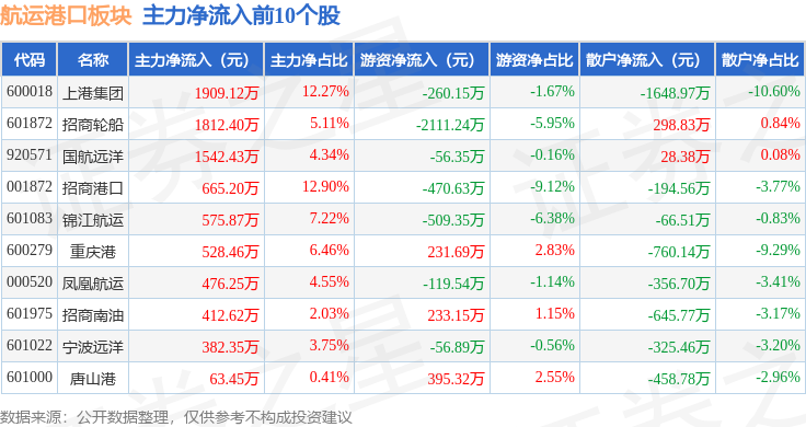 从资金流向上来看,当日航运港口板块主力资金净流出6.04亿元,游资资金净流入1.54亿元,散户资金净流入4.5亿元。航运港口板块个股资金流向见下表: