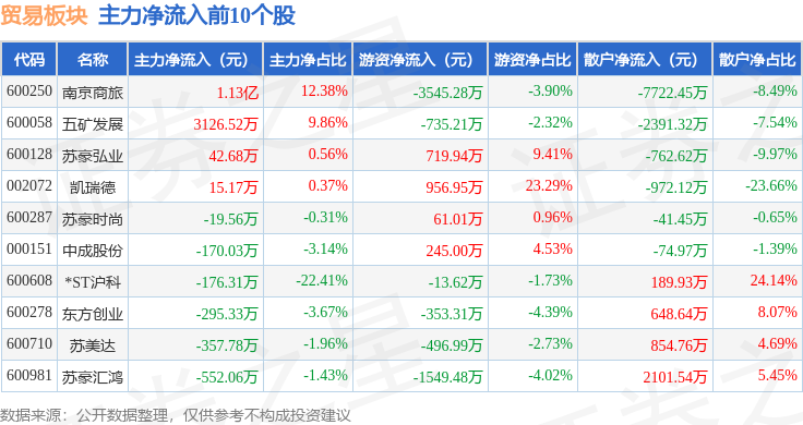 从资金流向上来看,当日贸易板块主力资金净流入1082.13万元,游资资金净流出1381.02万元,散户资金净流入298.89万元。贸易板块个股资金流向见下表: