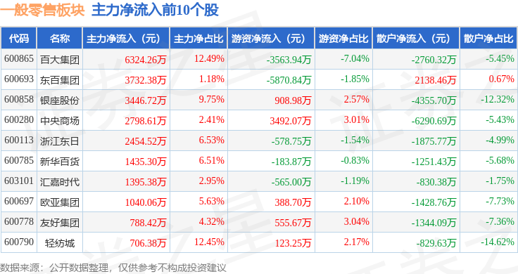 从资金流向上来看,当日一般零售板块主力资金净流出29.53亿元,游资资金净流入4.32亿元,散户资金净流入25.21亿元。一般零售板块个股资金流向见下表: