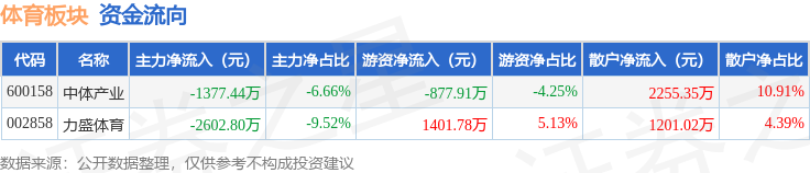 从资金流向上来看,当日体育板块主力资金净流出3980.24万元,游资资金净流入523.87万元,散户资金净流入3456.37万元。体育板块个股资金流向见下表: