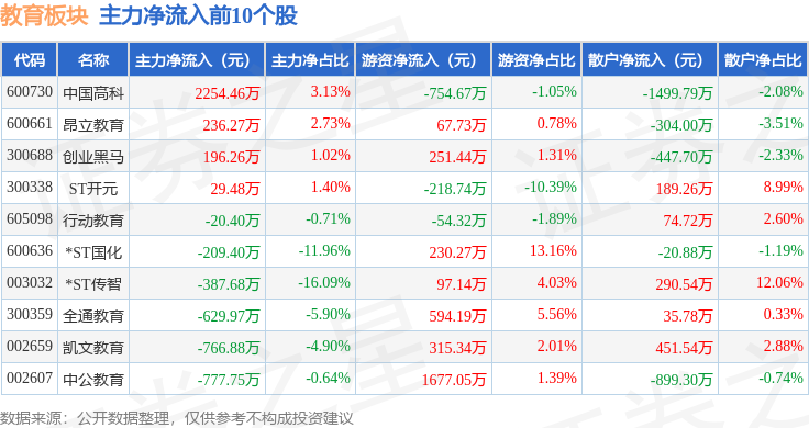 从资金流向上来看,当日教育板块主力资金净流出2.27亿元,游资资金净流出985.9万元,散户资金净流入2.37亿元。教育板块个股资金流向见下表: