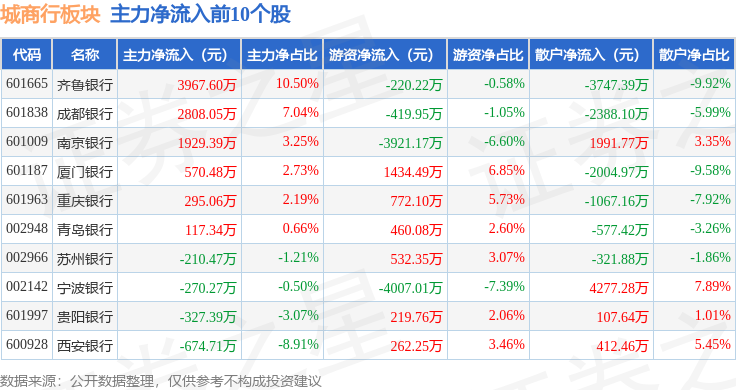 从资金流向上来看,当日城商行板块主力资金净流出7715.14万元,游资资金净流入6492.73万元,散户资金净流入1222.41万元。城商行板块个股资金流向见下表:
