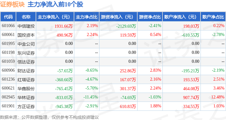 从资金流向上来看,当日证券板块主力资金净流出24.56亿元,游资资金净流入8.4亿元,散户资金净流入16.16亿元。证券板块个股资金流向见下表: