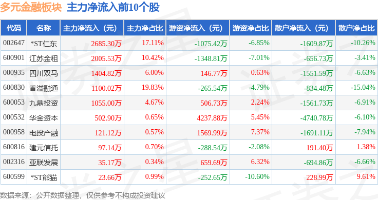 从资金流向上来看,当日多元金融板块主力资金净流出4.3亿元,游资资金净流入1.33亿元,散户资金净流入2.97亿元。多元金融板块个股资金流向见下表: